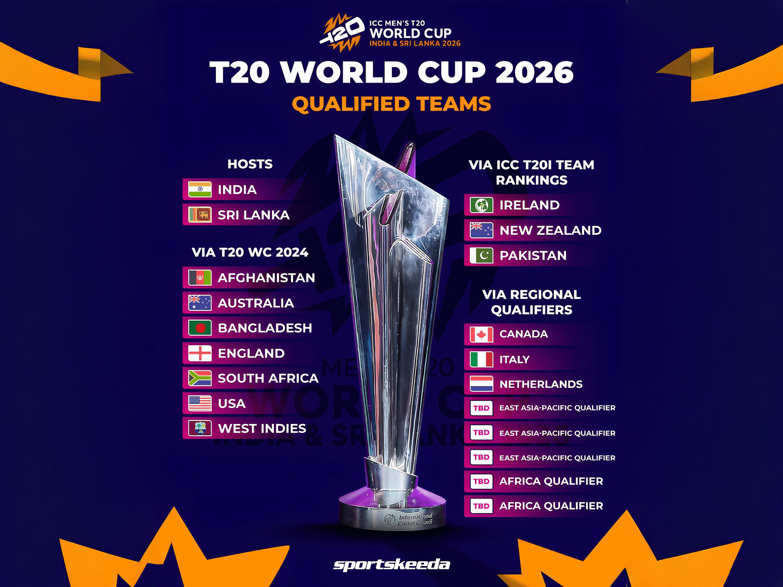 Other direct entries include New Zealand, Pakistan, and Ireland based on T20 rankings. From regional qualifiers: